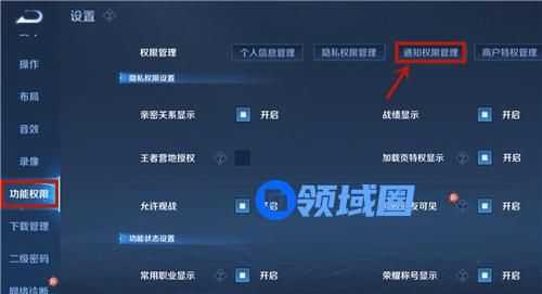 首先在游戏内打开设置,选中左侧的【功能权限】一项,点击权限管理的【通知权限管理】。