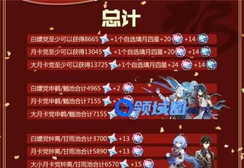 普通玩家可以获得8600原石+20个纠缠之缘+14个相遇之缘+一个璃月自选四星角色,整个换算下来,普通玩家至少都能抽到一个五星,如果小保底不歪的话,魈、申鹤、钟离和甘雨就是四选一了。