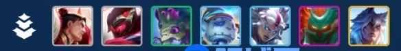 6人口,基本这时候就可以开三尊者过渡了,运气好拿到三费卡的锤石或者俄洛伊搭配就可以开4法师或者三灵魂莲华过度了,前期法师装备可以直接给到阿狸用。