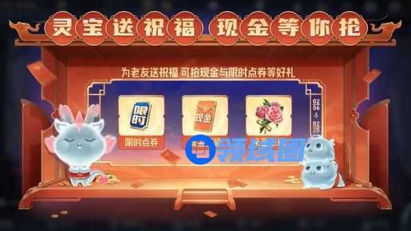 【灵宝祝福】活动入口也位于活动中心-一聚成龙,活动时间为2月6日逐步开启至2月19日前可参与,2月20日至2月25日可继续领奖。参与活动的玩家可以通过发送和领取灵宝群祝福红包,以及给老朋友发送英雄视频祝福,来获得各种奖励。