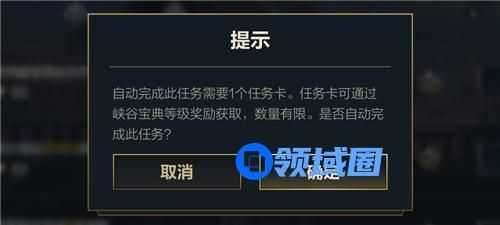 然后会弹出一个窗口,上面提示自动完成这个任务需要消耗一个任务卡,点击确定之后,这个任务就无需满足条件直接完成了。
