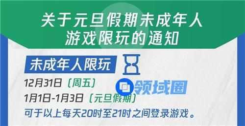 首先官方已经发放了元旦假期的未成年人限玩通知,可以在1月1日-1月3日,每天【20:00-21:00】之间登录游戏。也就是说,在元旦假期这三天,每天都能在晚上八点到九点,玩一个小时的游戏。