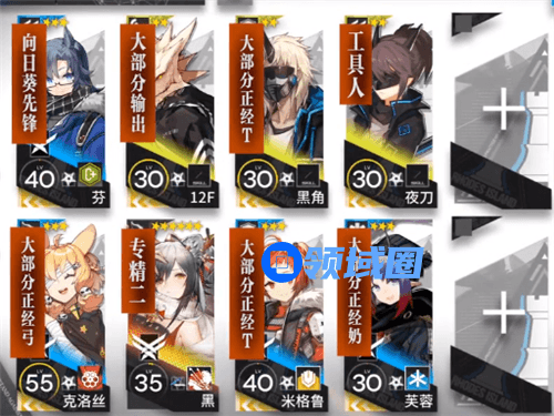 狙击:核心 黑(专二)、常规单体狙击*1(克洛丝)、高台任意输出(12F)