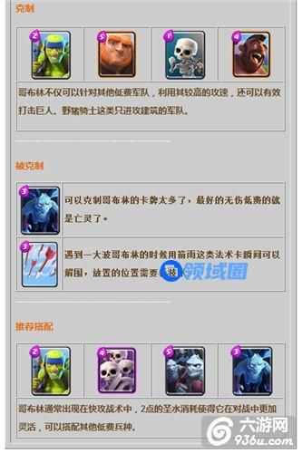 跑得快可能是唯一的优势了,可以欺负欺负只会打塔的大胖和野猪,和属性低的不像话的1费骷髅堆。对方放下了巨人或者石头人,我们就可以用刺刀哥布林去消耗这些肉的血量。对方的野猪冲过来了,刺刀哥布林可以只让野猪只打一下防御塔 然后被消灭。
