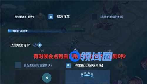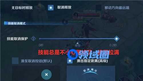 1、习惯性地技能拖动幅度较大,经常在团战中不小心取消技能。这种情况建议将技能取消保护【拖到最右边】,也就是设置为0.2秒,有了这0.2秒的缓冲时间,就能防止技能被我们不小心取消了。