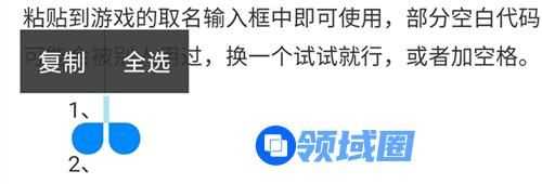 注释:长按数字序号顿号后的空白处复制,需要拉到最右边,如上图所示。然后粘贴到游戏的取名输入框中即可使用,部分空白代码可能会被别人用过,换一个试试就行,或者加空格。