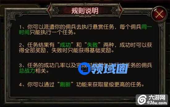 你可以派遣你的佣兵去执行悬赏任务,每个佣兵同时只能执行一个任务。任务成功时可以获得全部奖励,即使失败了也能获得基础奖励。