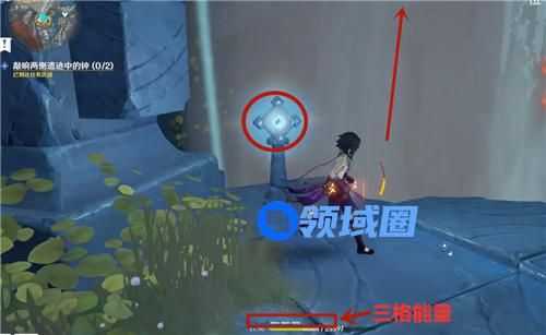 顺着风场来到上方的平台,给这个石头充能,必须是三个能量才能充。