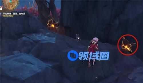 带着这颗岩种子靠近机关,岩种子会自动飞进机关内部,然后找好角度对着磐键的方向攻击机关,机关就会向磐键发射冲击波,把磐键打下来。(PS:此时机关损毁,可以看到对面还有一个机关。)
