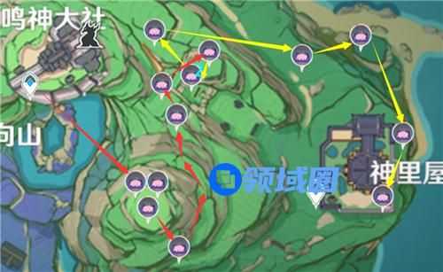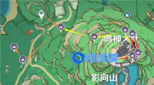 影向山:跳到下面的洞里,第一个的位置在浮空鸟居旁边的山岩上,黄色箭头代表洞下面。