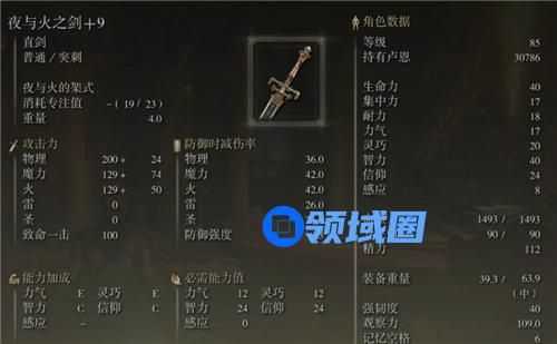 总而言之,夜与火之剑还是主点智力,毕竟这是法师武器。其次点生命值,保证吃后期BOSS一招死不掉。然后集中力要点到17最佳,耐力在后面捡到更重的装备时也要点一些,保持在中等重量。