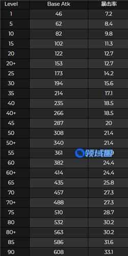 满级属性面板为:608基础攻击力、33.1%暴击率。各等级阶段的属性加成如下图所示。