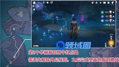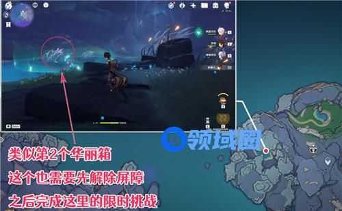 解密方式:和第二个华丽宝箱类似,都是需要先找到三个仙灵解开屏障,仙灵位置如下。