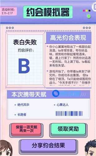 选择天赋并且给属性加点,玩一把游戏。无论表白成功与否,都会在结算界面看到一个【领取奖励】,点击这个按钮。