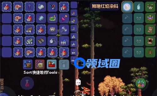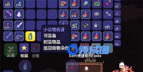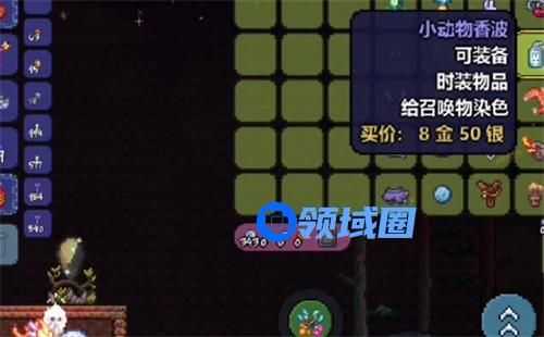 在装备召唤武器的情况下,点击这个染料,就能给召唤物染色了。染料一共有【鲜艳海蓝染料】、【鲜艳红焰染料】、【闪光染料】、【暮光染料】这四种。这些染料要是【染料商】为了换取奇异植物而给予的任务奖励,具有橙色和稀有度级别的染料只会在困难模式的世界中获得。