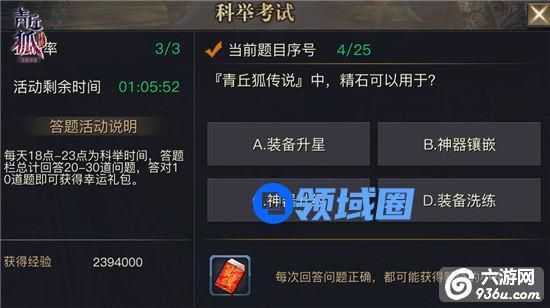 科举考试是《青丘狐传说》手游中的每日活动,每天18点-23点为科举考试时间,系 统会提醒玩家前往界面答题。该活动被视为游戏中最有趣、好玩的活动,只要完成20-30道科举试题,无论正确与否都会获得经验和银两,还有游戏奖励也会随时送出,参加科举答题,升级、赚钱、奖励,三项工作一并完成。小伙伴们可千万要记得调好闹钟,每天准时上线答题哦!