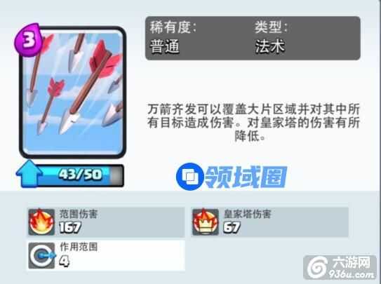 万箭齐发可以覆盖大片区域并对其中所有目标造成伤害,对皇家塔的伤害有所降低。