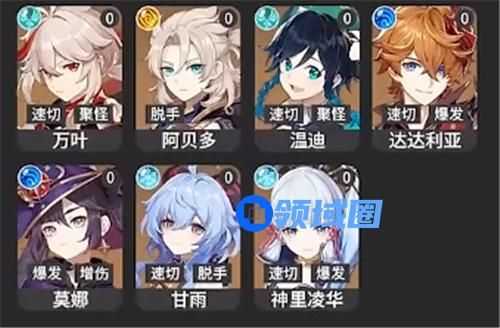 T1:枫原万叶、阿贝多、温迪、达达利亚、莫娜、甘雨、神里绫华