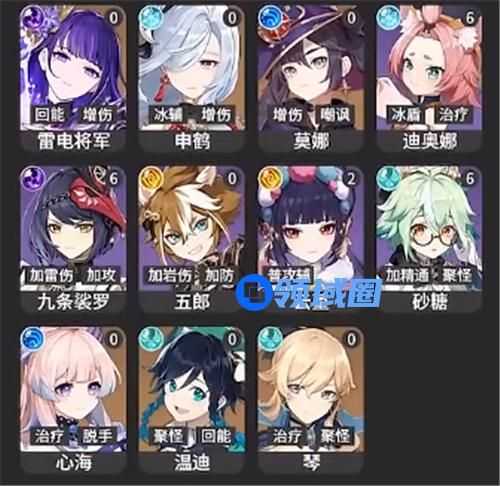 T1:雷电将军、申鹤、莫娜、迪奥娜、九条裟罗、五郎、云堇、砂糖、心海、温迪、琴