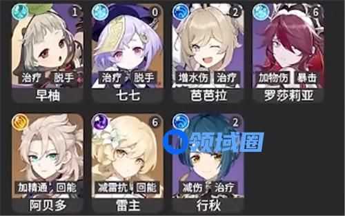 T2:早柚、七七、芭芭拉、罗莎莉亚、阿贝多、雷主、行秋