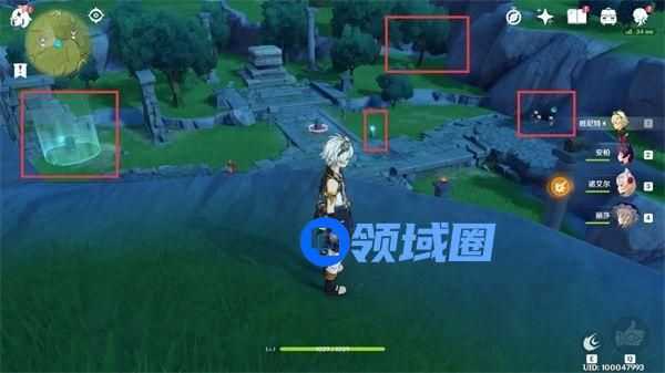 风仙灵大致位置示意,风元素柱右手第一个秦王绕柱的风仙灵,这个风仙灵最容易发现,将石柱上的碎石打掉即可归位。