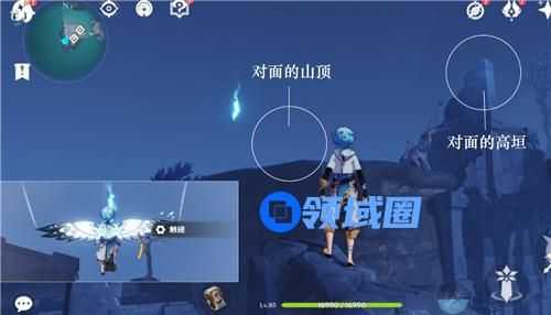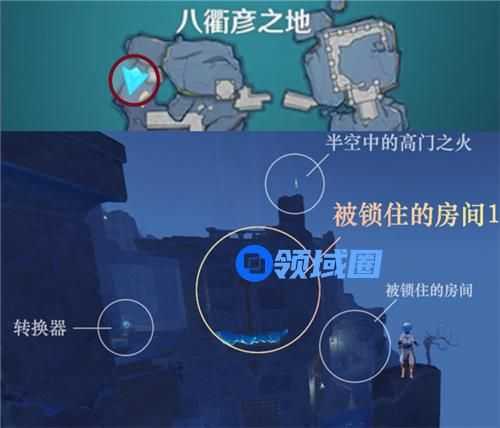 首先八衢彦之地一共有4个高门之火,两个被锁住的房间里各有1个,空中有1个,光屏障内有1个。第一个高门之火在下图所示的高空中。矮的角色可以从对面的高垣飞,高的角色从对面的山顶飞,以此来接近半空中的高门之火。