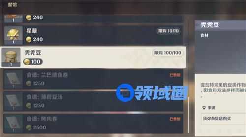 往下翻,这里就有一个名为秃秃豆的食材,价格为100摩拉一个。