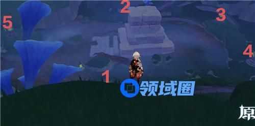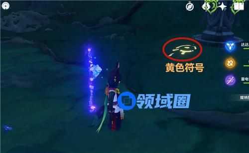 然后观察草元素方碑周围地面,有没有下图所示的这个黄色符号,哪个草元素方碑有黄符号,就带着草种子攻击这个草元素方碑。