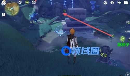 首先来到下图所示的位置,召唤草种子,用弓箭破坏发绿光的石头,第五块草元素方碑就会出现。