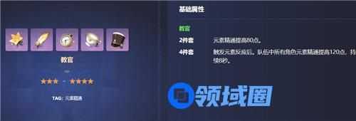 2、2乐团套+2精通套:稳定提供160元素精通,且金色圣遗物能达到+20强化等级,加的元素精通属性比四星的教官多。