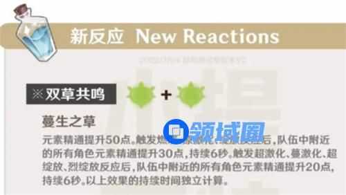 言归正传,双草共鸣的效果就是只加元素精通,并不会加生命值和治疗效果,毕竟草系是元素反应和核心元素,应该集中一点才是。