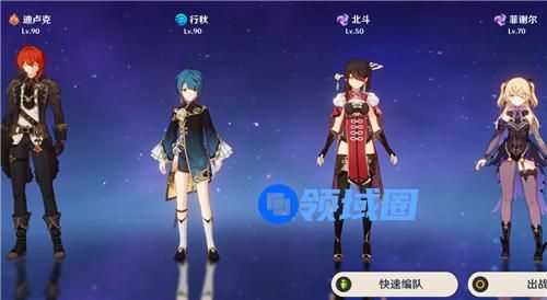 2、炎魔武装队:迪卢克+行秋+北斗+菲谢尔