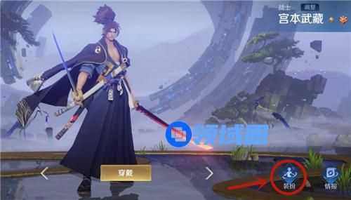 首先来到宫本武藏的英雄界面,点击右下角的【装扮】按钮。