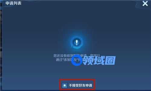 最后在这个弹窗中的底栏,就可以选中【不接受好友申请】的选项了,勾选后就不会收到其他玩家的好友申请,因为他们只要点申请好友,就会被系统提示该玩家未开启好友申请功能。