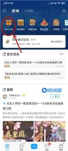 首先打开米游社APP,登录账号之后,点击顶栏左上角的旅行工具。