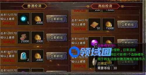 除此之外,血脉精华可以购买6/12/28/98r的礼包获得,98元的礼包是给5000个血脉精华。还有就是投资系统中,击杀160只70级以上的BOSS,可以领取1000个血脉精丹,使用一个可以获得50个血脉精华。