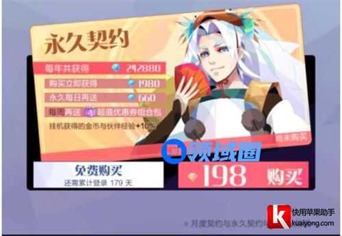 永久卡是非常值得购买的。玩家花费198元,就可以解锁永久卡。其中永久卡购买就会给1980的砖石,每日还送660砖石,每周还给礼包的优惠券,挂机有10%的经验加成。非常的良心。