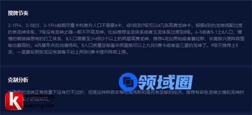 运营思路:前期优先拿巨人腰带做肉装。阵容成型需要大量的经济支撑,所以前期最好能用金鳞龙过渡先攒钱,没有3金鳞龙也可以选择海盗的幻镜、碧波龙或者强势连胜保证血量经济。3-2来龙神时代或者龙神之魂,就是天胡开局,不管是什么高费龙神都有足够的战斗力到8级。