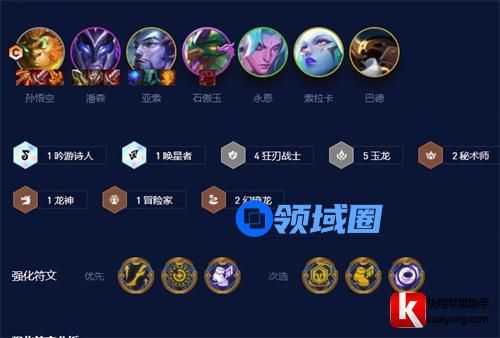 阵容组成:塞拉斯、石傲玉、潘森、亚索、索拉卡、孙悟空、巴德。组成5玉龙+4狂刃+2格斗+2幽影+1龙神+1唤星者。