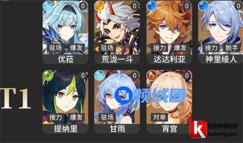 T1:优菈,荒泷一斗,达达利亚,神里绫人,提纳里,甘雨,宵宫。