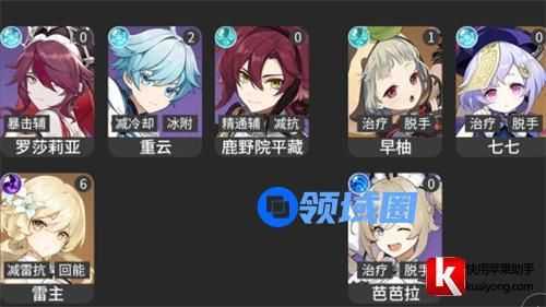 T2:罗萨莉亚,重云,鹿野院平藏,雷主,早柚,芭芭拉,七七。