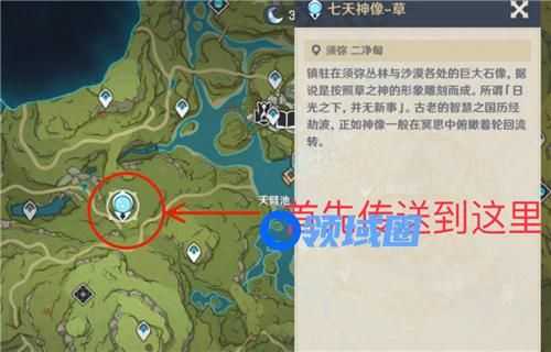 首先想要解锁这个水下传送锚点,就必须放水把水位降下去,需要一个草属性的角色,草主就行了,让主角和草神像共鸣即可。第一步就是传送到二净甸的七天神像。