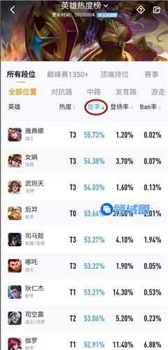 在英雄热度榜中,点击胜率这一项,就会展现出所有段位的英雄胜率排名情况了。如果你想筛选出高端局的英雄胜率排名,就可以切换到巅峰1350+,胜率的排名英雄会有所变化的。