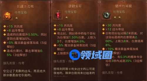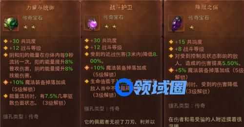 狂战士之眼能够大幅提升输出能力,无畏宝石提升法师的对群伤害,连锁宝石能提高普攻速度,猎神的凝视对远程职业的伤害提升很高,阴阳玉技能普攻每九秒一次增伤循环,战斗护卫减伤能力很强,提高生存能力。