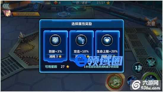 玩家每连续通过3的整数倍关卡时(如3、6、9关),系统会随机提供3种增益状态,例如:攻击增强、生命恢复和宠物复活等等。玩家可通过消耗本次获得星数来兑换其中一种增益状态,兑换不同增益状态所需星数也不同。