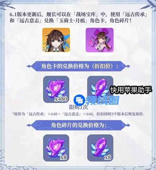 6.1版本更新后,舰长可以通过扩充补给获取「玉骑士·月痕」角色卡,通过精准补给获取「玉骑士·月痕」推荐装备,后期会在其他的版本的当中返场抽取。