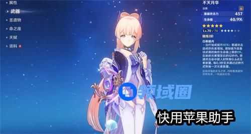 而专武不灭月华的加成的非常的高,词条方面是有着608的基础攻击力,49.6%的生命值加成,非常的强并且武器特效有基于生命值加伤害的效果,还有治疗效果以及充能效果,所以推荐专武。