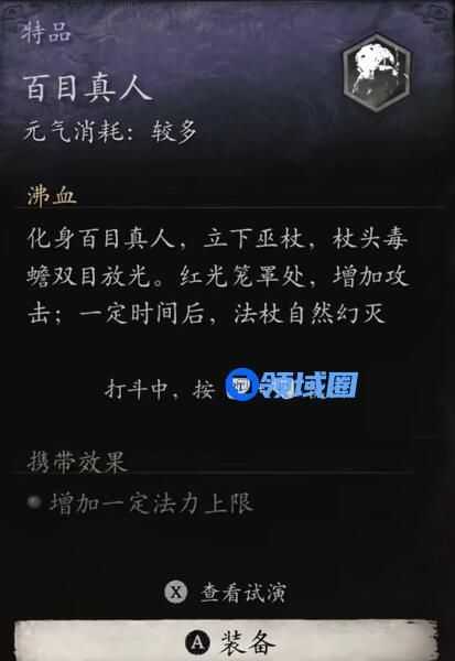 【百目真人】精魄在第二章可以获得,携带后能够增加法力上限,利用该效果配合禁字法提升攻击,后面可以换成【不能】。