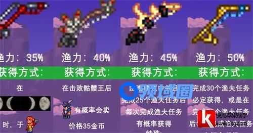 金钓竿:渔夫任务奖励,完成30个任务时会得到,或者在超过75个任务之后有1/250(0.4%)几率得到。渔力50%稀有度是橙色。