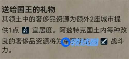前期宜居度的重要来源,一个正确改良的奢侈品最多可以给4个城市+1宜居度,奢侈品的宜居度是系统自动分配的,同种奢侈品的效果是无法多个叠加的。